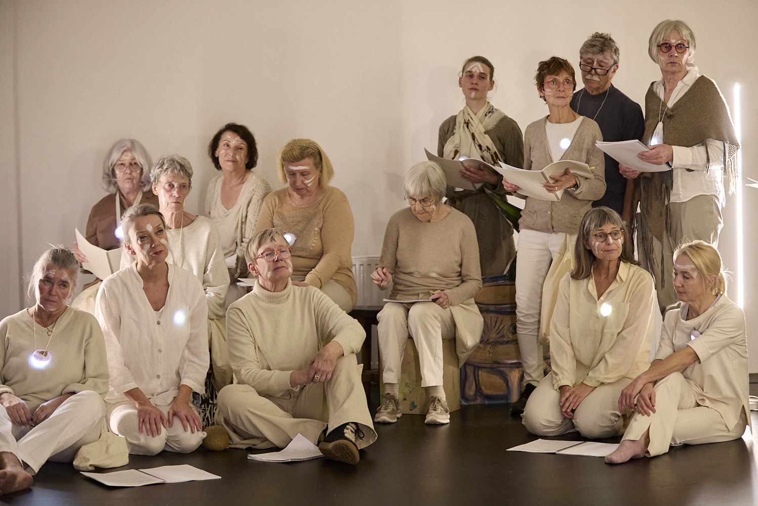 Der Sprechchor Dortmund kann laut, leise, sanft, wütend, säuselnd. Ekstase und Schweigen. Der Chor bringt über zehn Jahre Bühnenerfahrung mit, alle wissen, wie man sich als Chor oder Gruppe von Kollektivindividuen auf einer Bühne bewegt. Jedes Jahr hat der Gesamtchor oder haben kleinere Teilchöre an mehreren Theaterproduktionen mitgewirkt oder gemeinsam mit Dramaturg:innen und Regisseur:innen eigene Stücke entwickelt. Wir – der Sprechchor Dortmund – waren Nonnen und Zwerge, lebende Tote, Fußballspieler und ein Gewitter in der Nacht, Dorian Gray und Kaspar Hauser – und einmal sogar eine Rakete.